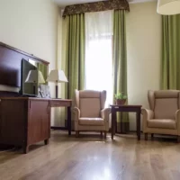 - Wyposażenie: Łóżko (z odpowiednim materacem), szafka nocna, szafa, telewizor, telefon, internet (Wi-Fi), stolik, krzesła, sofa.