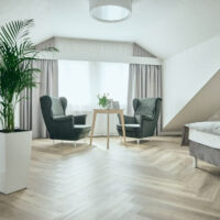 - Pokoje: Oferowane są 1- oraz 2-osobowe pokoje (łącznie 33 pokoje). Pokoje są przestrzenne, jasne i komfortowe, z wyraźnym podziałem na strefę dzienną i nocną.